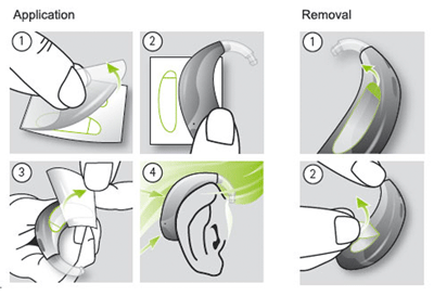 The stickers are shaped to follow the contour of a BTE hearing aid or implant processor and are approx. 23mm long x 8mm wide. They are compatible with any make or model of behind the ear hearing aid or cochlear implant processor.
