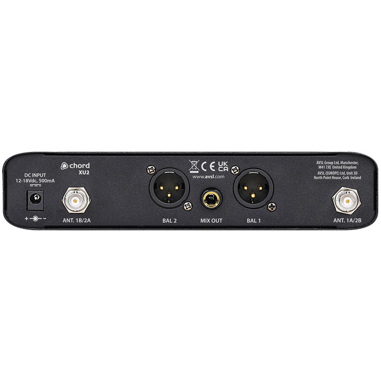 Chord XU series wireless microphone systems offer pro-level features in a compact receiver with premium microphone transmitters. Supplied as a half-width 1U rack receiver with 2 channel & bodypack microphones with neckworn & lapel clip microphones. The receiver is a true diversity type with dual antennas and internal distribution for minimizing dropouts. The front panel has a volume control and indicator LEDs per channel alongside a colour TFT display with level indications for each channel and settings for channel frequencies and colours. Each transmitter also has its own LCD display for frequency and battery status, with a backlight that can be set to one of 6 colours for identification.