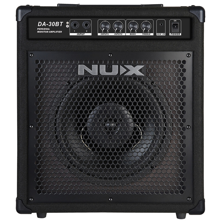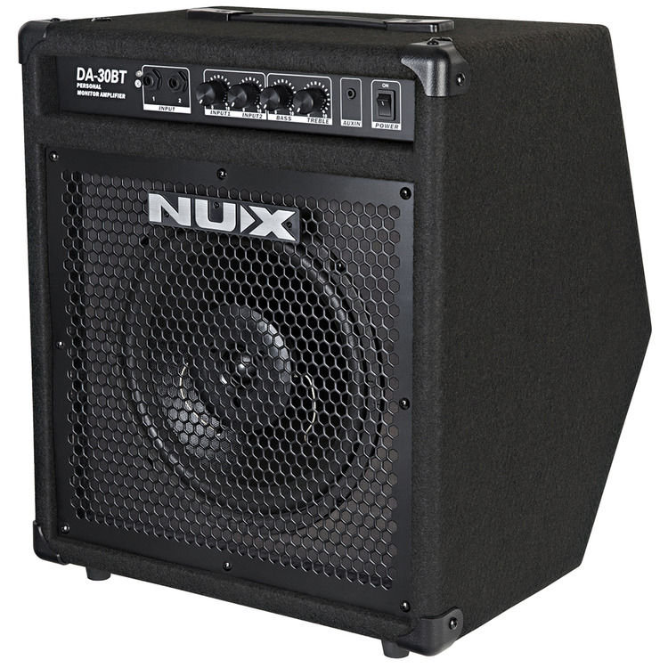 DA-30BT is a compact amplified speaker with a tilt-back cabinet for use as a wedge monitor. The internal 30W amplifier and 10" + 1" coaxial driver produce a full range output for accurate sound reproduction. 2 main input channels are joined by an Aux input and internal Bluetooth receiver for wireless playback of backing tracks from a smart phone. Designed for personal on-stage monitoring, FRFR amplification and e-drums backline